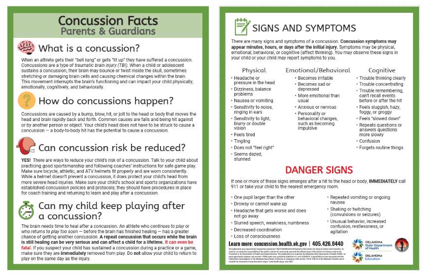 Putnam City Sports recognizes that concussions, a type of traumatic brain injury (TBI), are serious injuries with negative outcomes that can affect an individual physically, emotionally, behaviorally, and/or cognitively, with the potential for long-term impacts on brain development. While concussions have many causes, these brain injuries are commonly sustained by youth participating in athletics or other recreational activities. The purpose of this policy is to maximize safety with respect to sports and recreation related concussions by educating staff, team and game officials, athletes, and parents/guardians about concussions; providing guidance on how to prevent and manage concussions; and supporting youth returning to activities after a concussion, in accordance with Oklahoma state law (70 O.S. § 24-155). This policy will be reviewed on an annual basis. The participating program's Head Coach will be responsible for reviewing requirements of state law against this concussion policy and for seeking any technical assistance needed for policy review and revision. The participating program's Head Coach will be responsible for implementation of this policy.